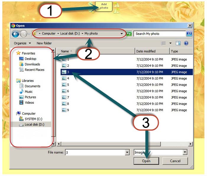 4. Select a folder on your computer with your photos. Select your photo and click on the "Open" button.